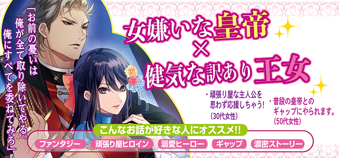 | 小国ハックワースの王女リアナは、レーヴェンガルト帝国の皇帝ヴィルフリートの側妃として召し上げられた。 形だけの側妃だと思っていたリアナだったが、突きつけられた冷たい言葉とは裏腹の優しい一面を見せてくれる ヴィルフリートに心は揺れ動くのだった。 舞踏会の日、側妃としての務めを果たすべくリアナは慎ましくもヴィルフリートの側に立っていた。 皇帝に挨拶をと舞踏会の出席者である貴族たちのなした長い列が一段落し、二人は用意された部屋へとともに戻る。 公務と打って変わって表情を和らげるヴィルフリートに、リアナは……? |